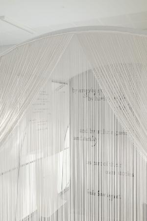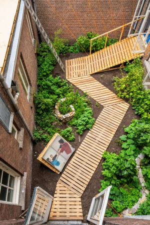 Spatial design of the garden to slow down, rest and repair. Suspension bridge that connects room and garden through the window.