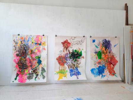 studio view with three from a series of eight drawings in progress
