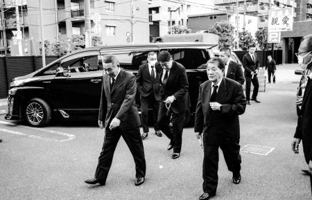 Officials of a large yakuza group posing near their headquarters in Asakusa, Tokyo.