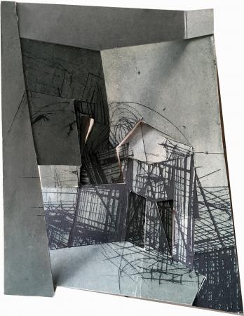 'Design for a stage' is een ruimtelijke constructie gemaakt vanuit eerder gemaakte houtsnede-stukken