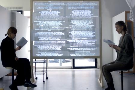 Sublimation print on translucent fabric 240 x 150 cm each A set of 2 Two juxtaposed narratives written by two different personal accounts together provide a brief summary of the background story of the protagonist and his publication Jag ritar en dörr på väggen med fingret, at the same time hinting to a diverse understanding and critique that reflect the culture of the two involved nations.